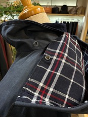 スナップボタンで取り外しのできる、ジャケットの裏地と同じチェック柄の生地をしようし、同じくオイルド加工されたフードも付属します。
