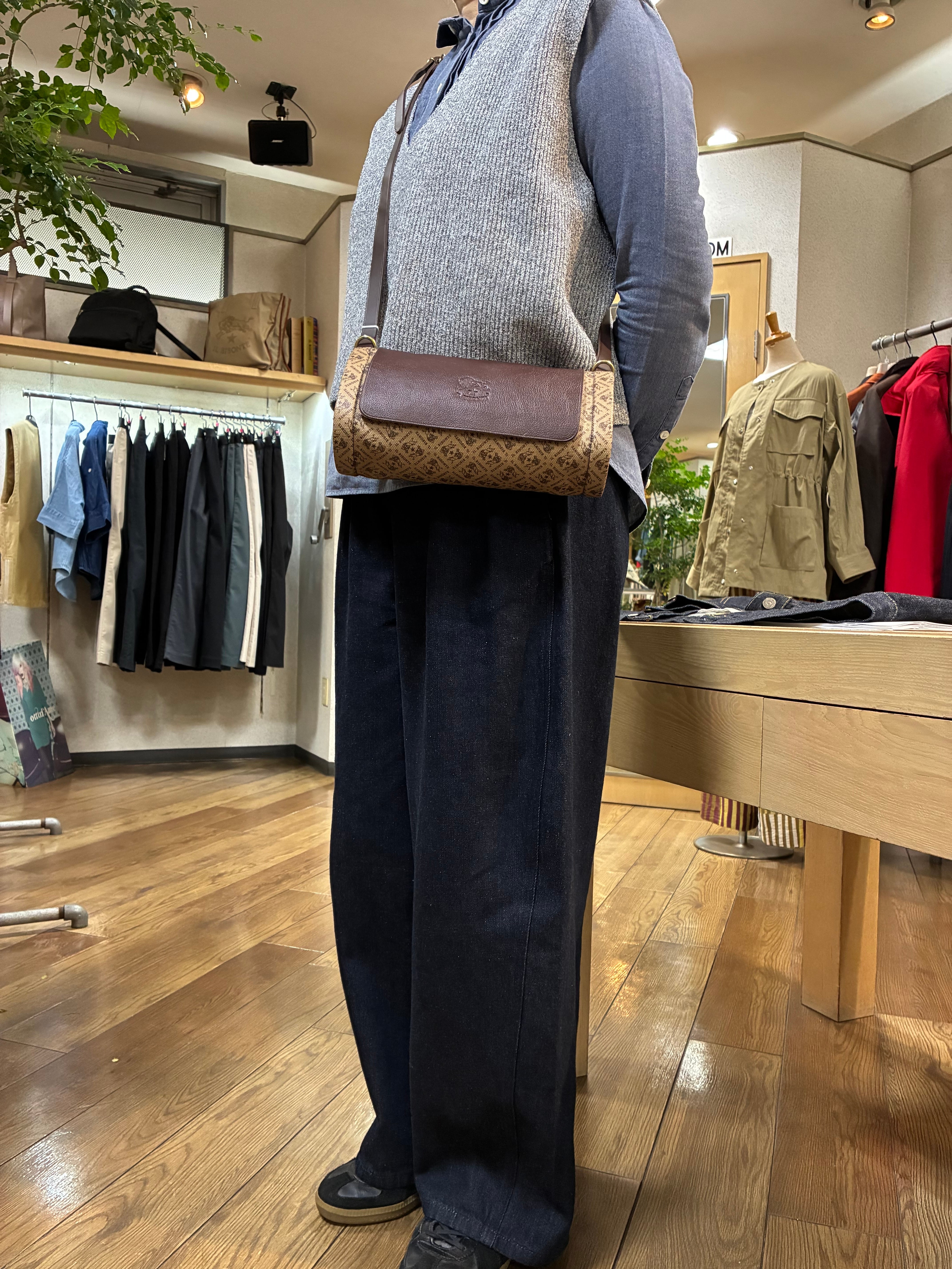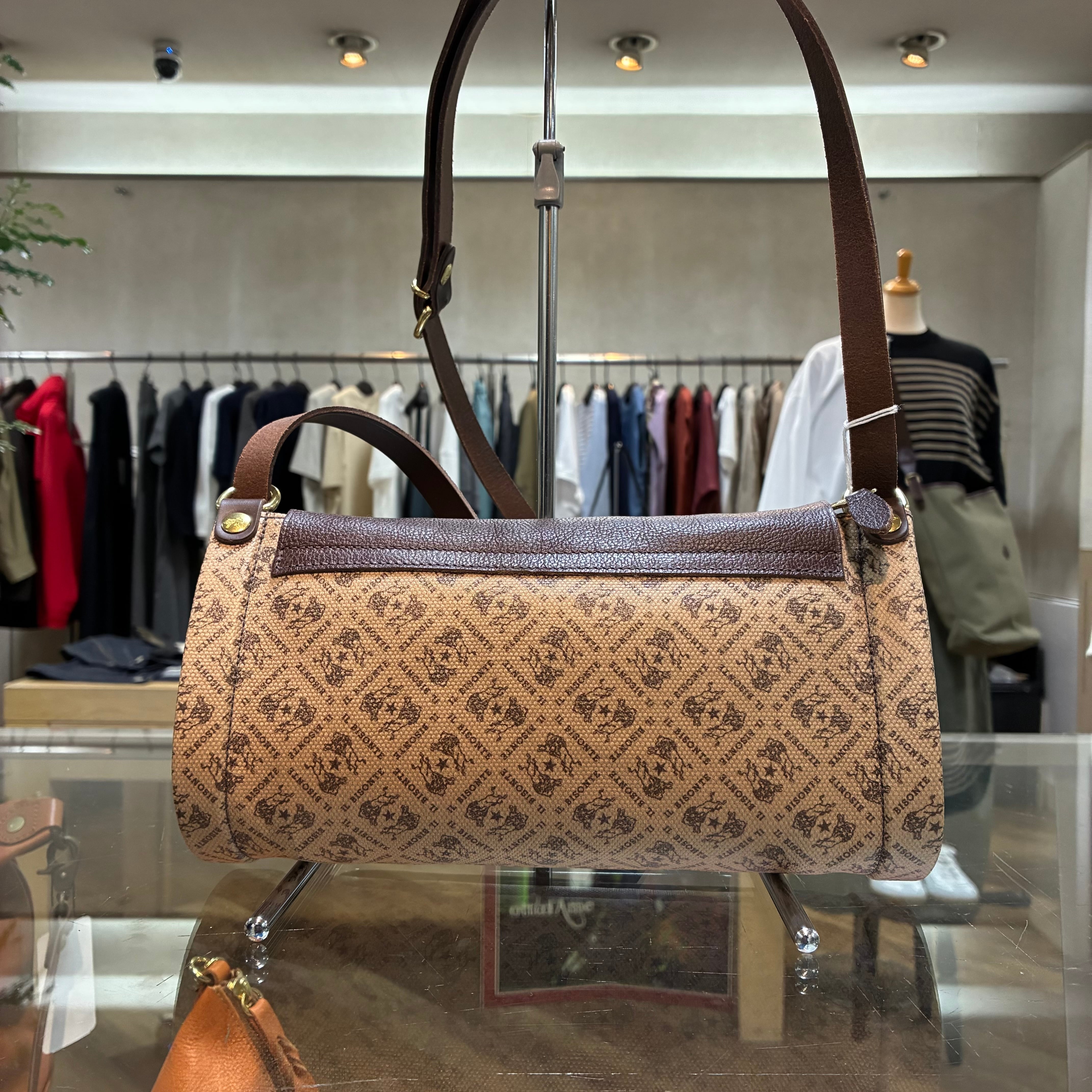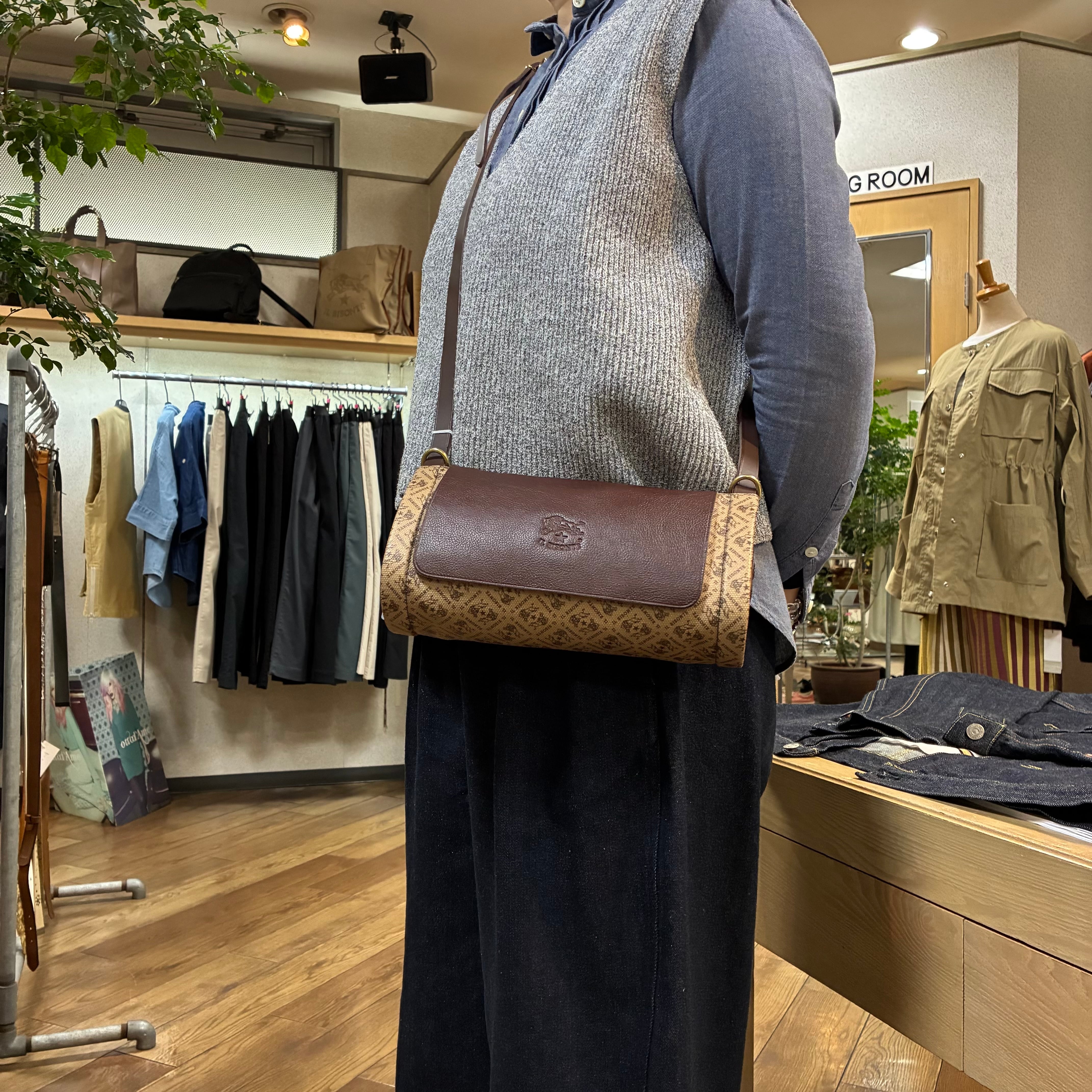IL BISONTE イルビゾンテ 日本限定 モノグラム プリント レザー 筒形ショルダーバッグ【54262305320】(COL ブラウン×ダークブラウン)