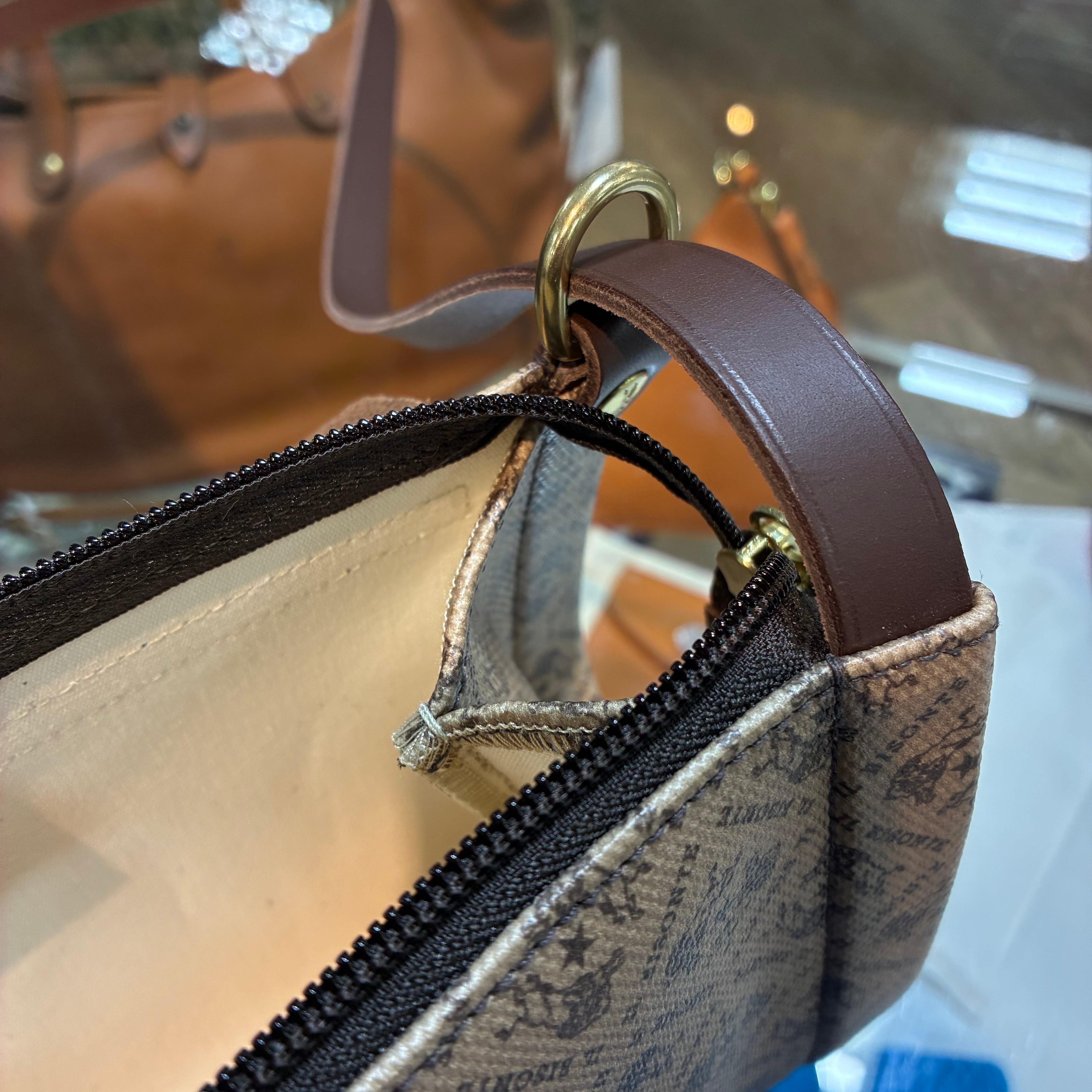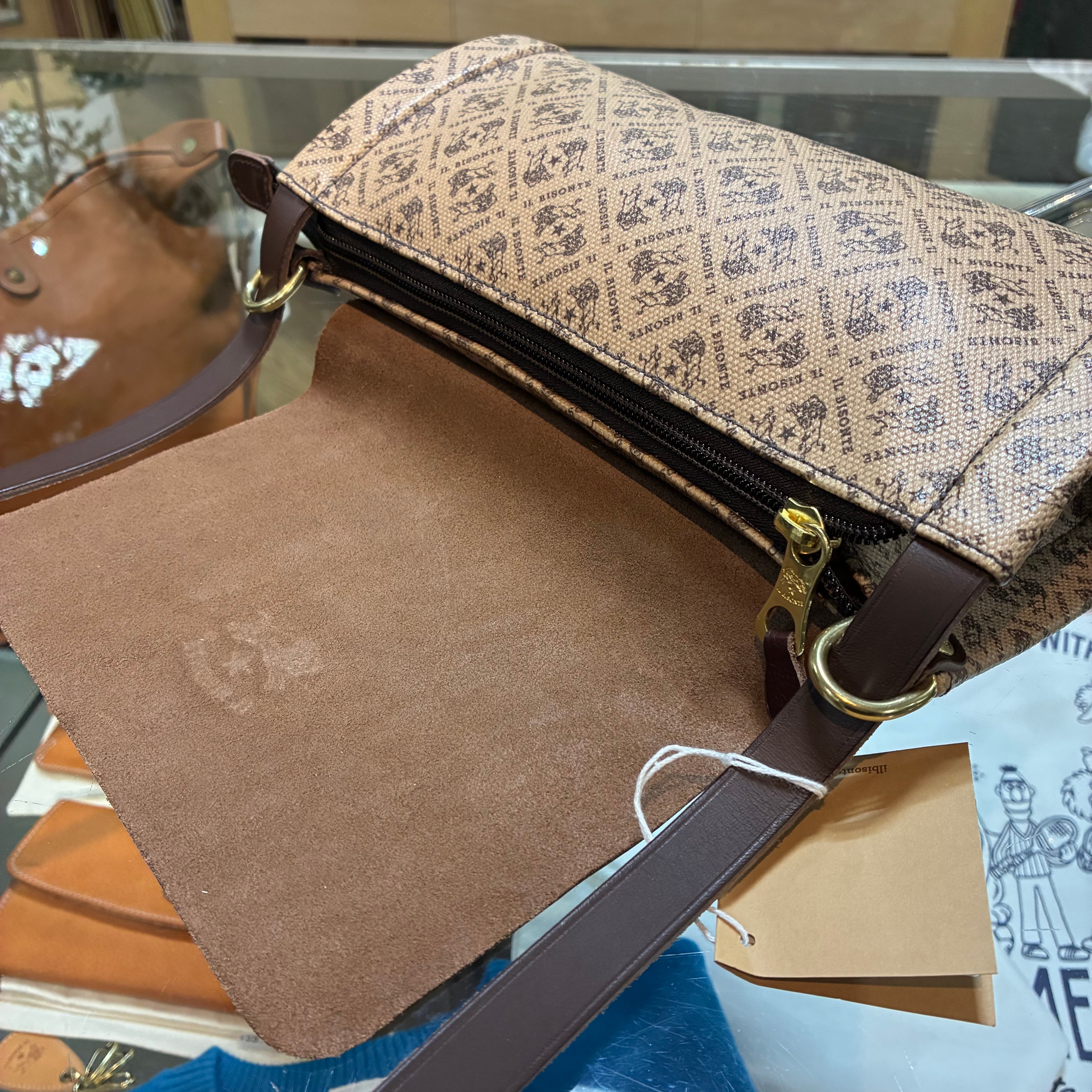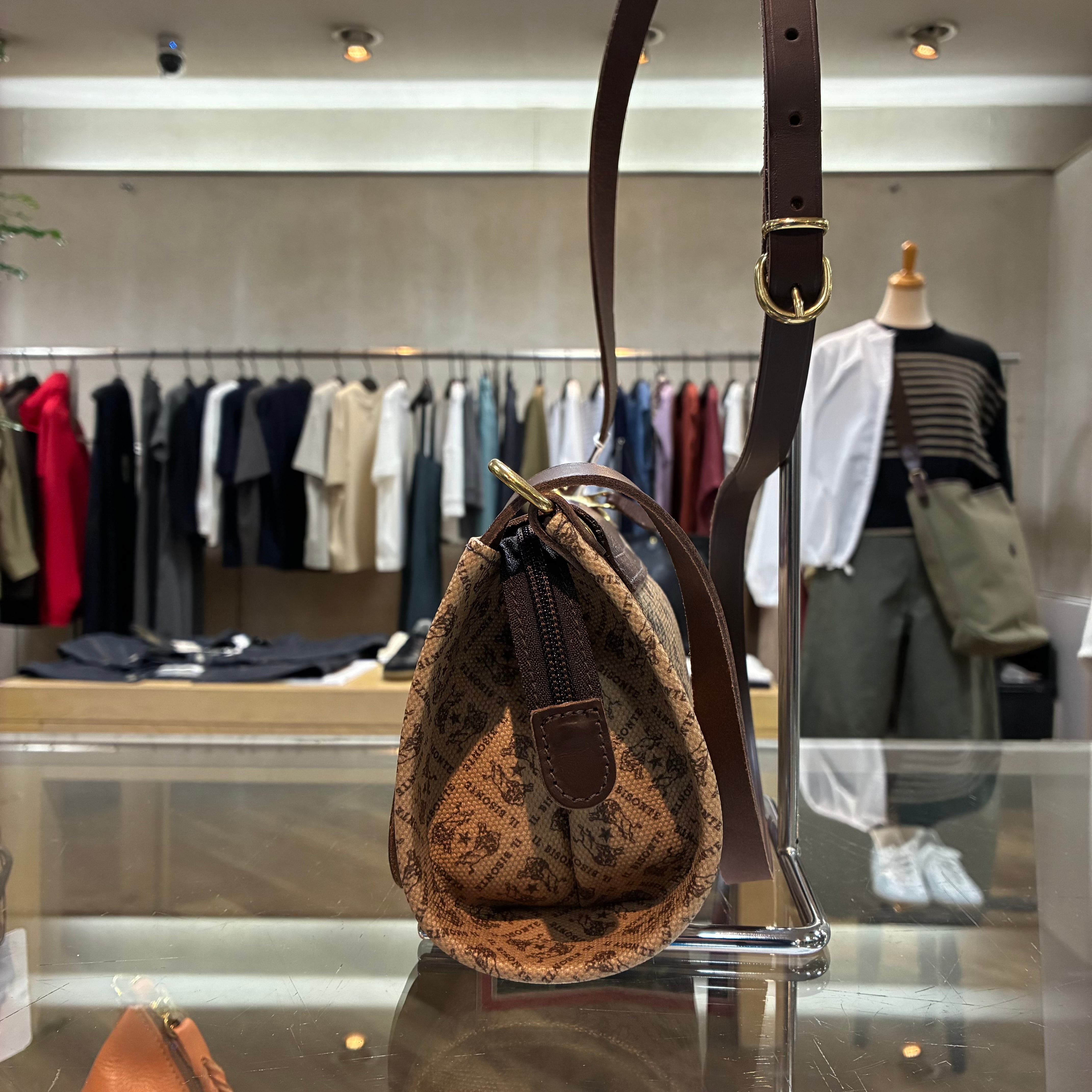 IL BISONTE イルビゾンテ 日本限定 モノグラム プリント レザー 筒形ショルダーバッグ【54262305320】(COL ブラウン×ダークブラウン)