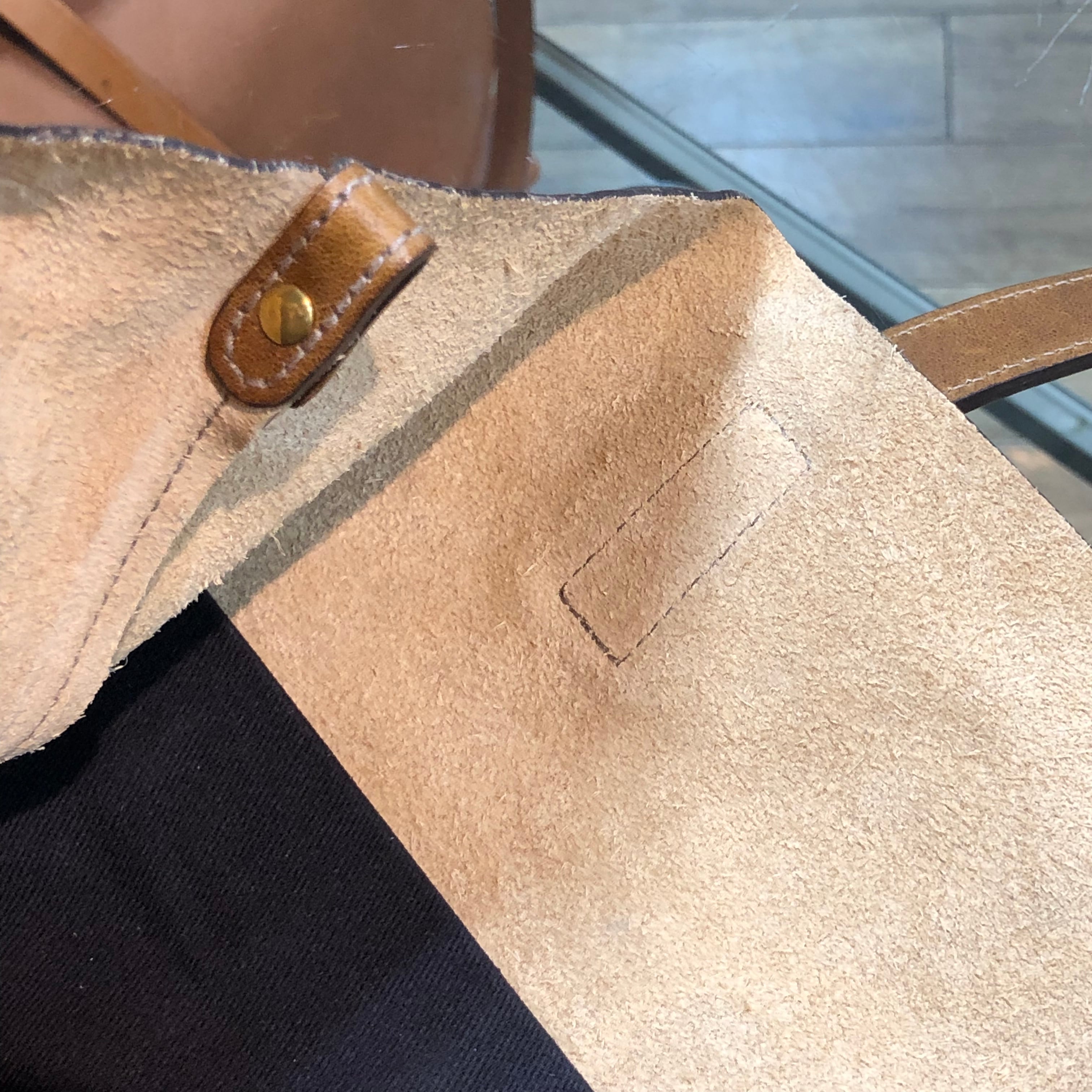 一枚革仕様で、大きめのキャンバスポケット、その上にカードサイズ(iPhoneX入ります)のレザーポケットが施されています。