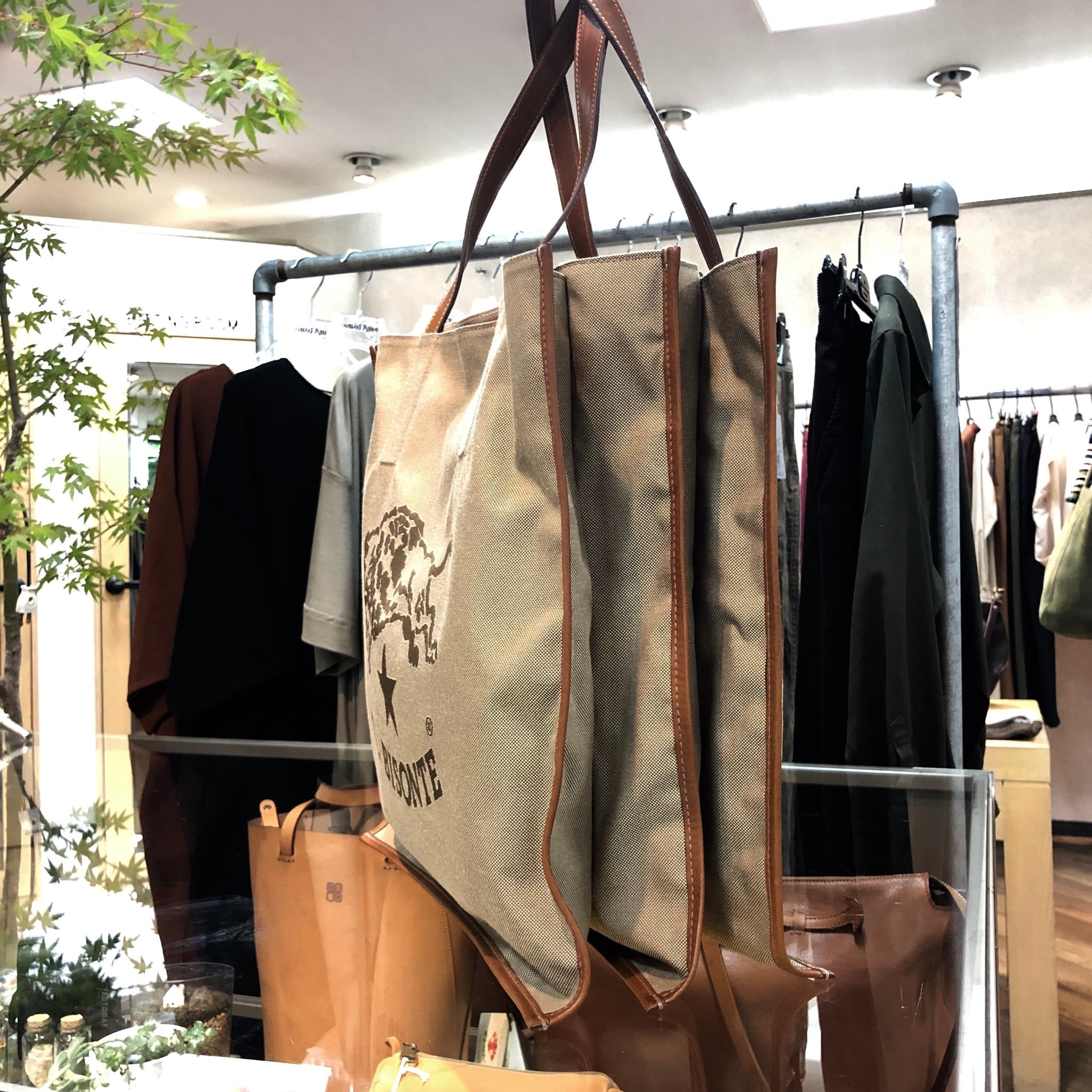 ナイロン・コットン・アクリルの耐水コーティングジャガード素材と、2019秋冬バケッタビンテージレザー新色チョコとコンビのトートバッグです。