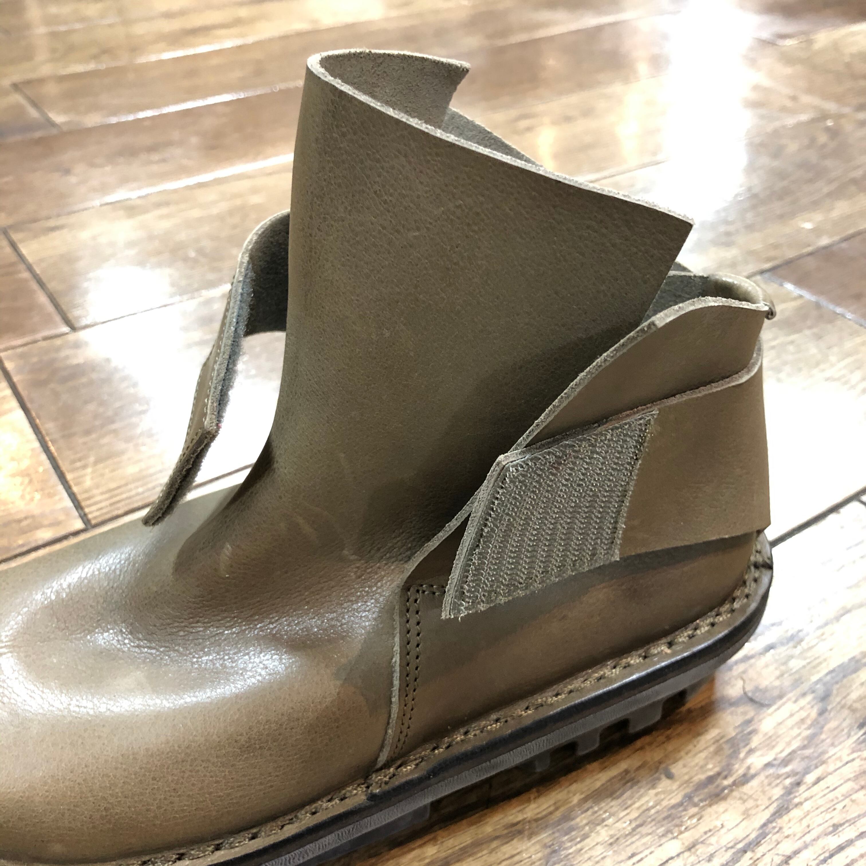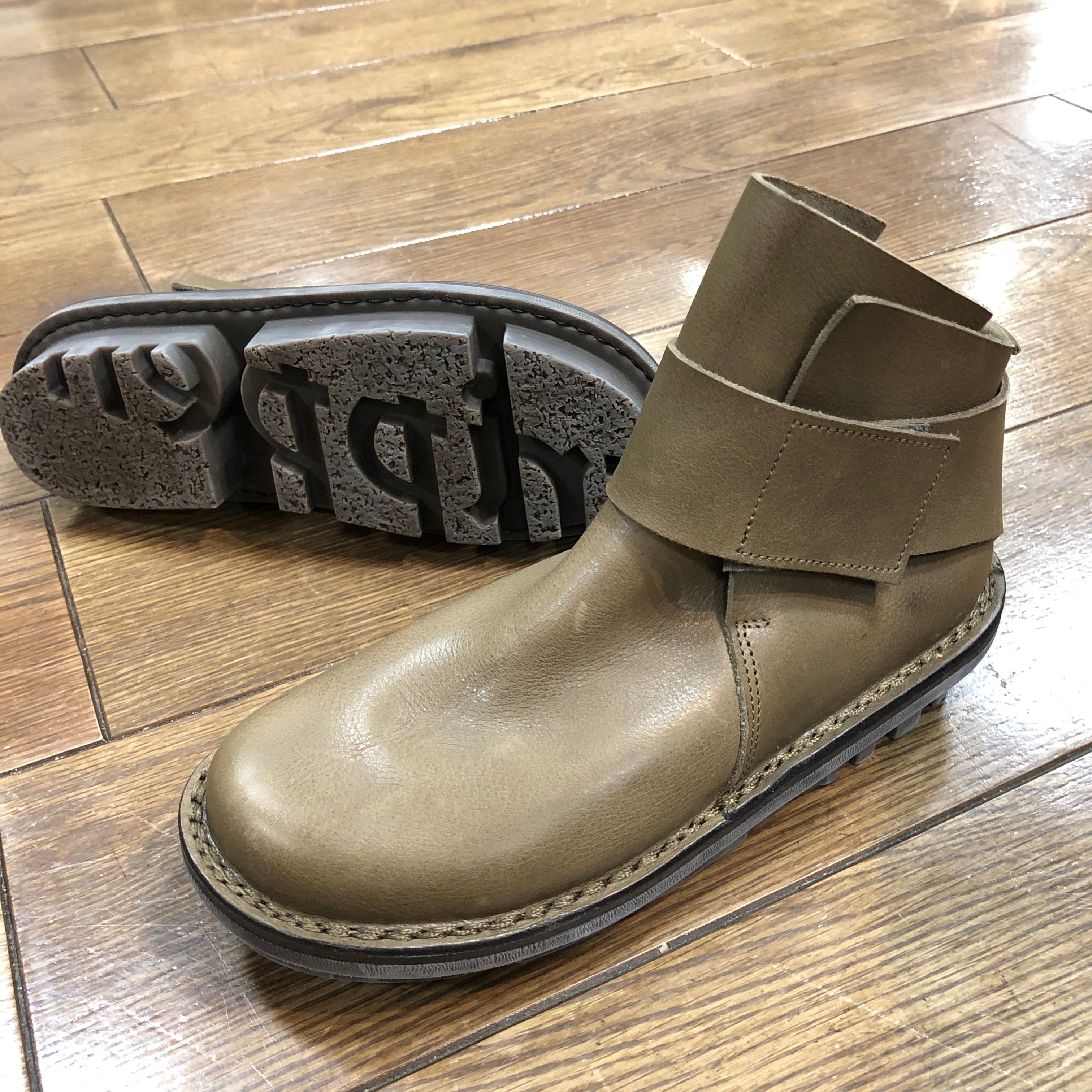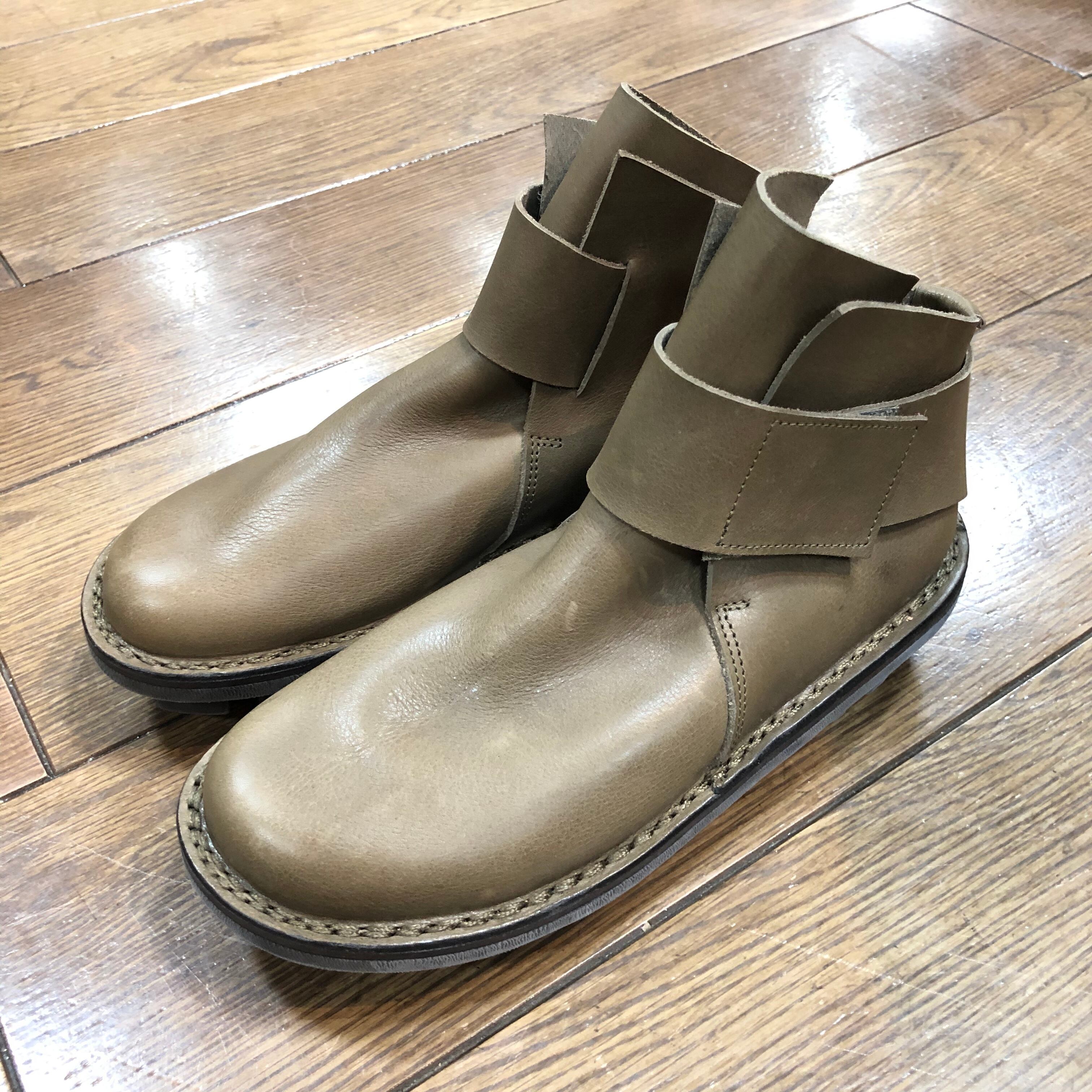 柔らかい1枚革を使用し履き口をしっかりしたベルクロテープで固定するシンプルなショートブーツに1枚革で足当たりがソフトです。