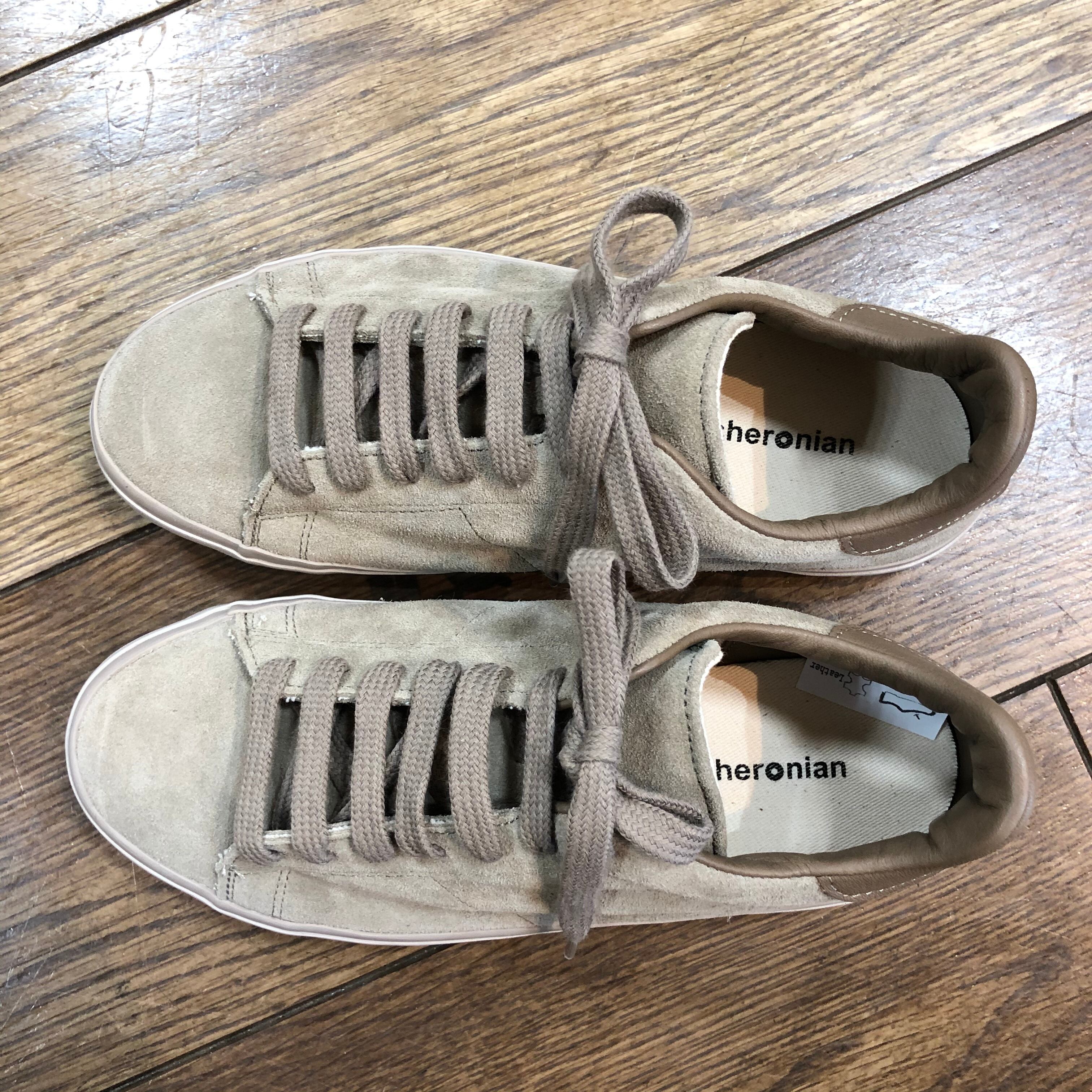 カラーは優しいグレージュ。靴紐、側面のテープ、ライニングをワントーンで上品にまとめています。