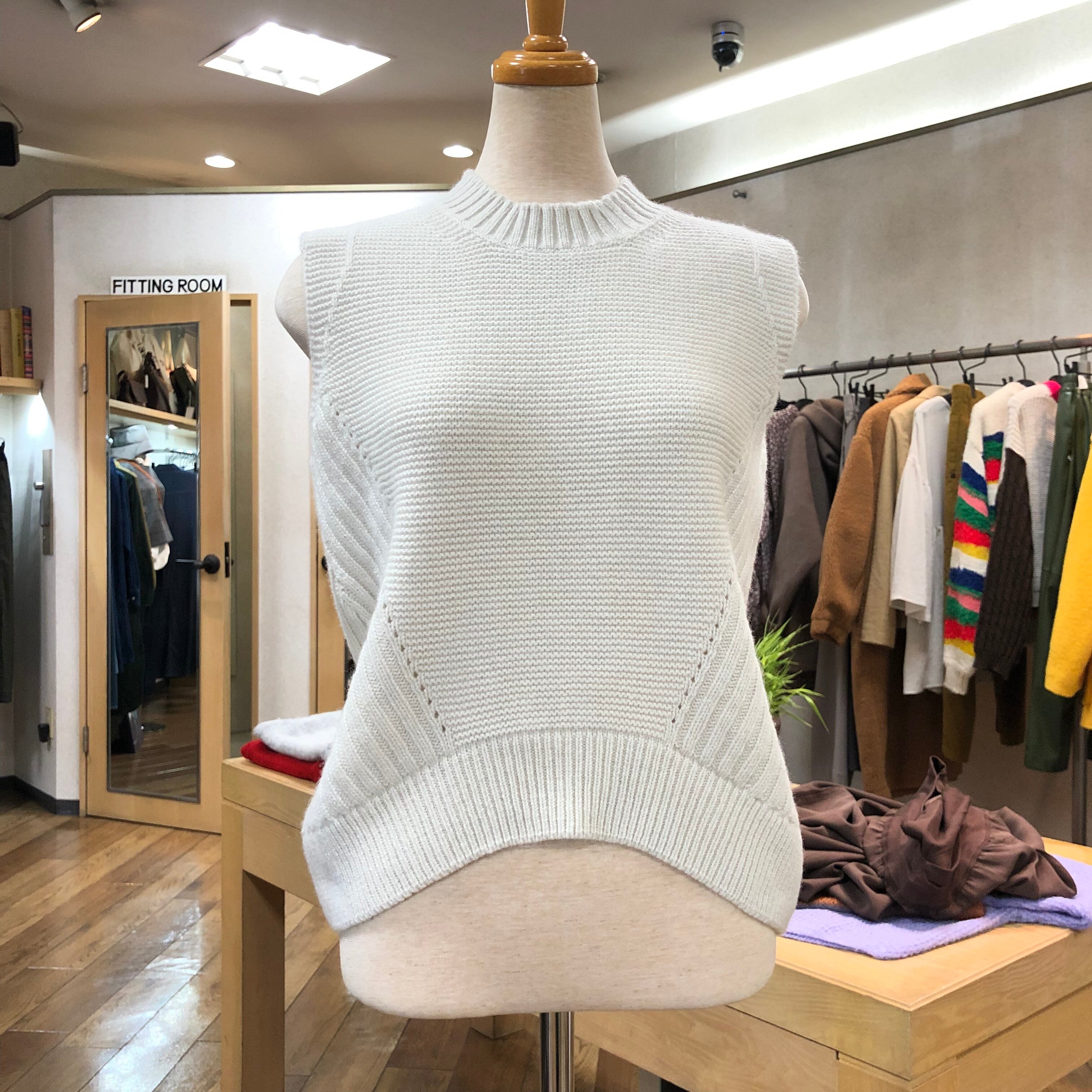 コンパクトでありながら丸みのあるシルエットに、前後のガーター編みに対して両サイドをワイドリブでやや長めにし、あしなが効果もあり、すっきりとしたニットベストです。